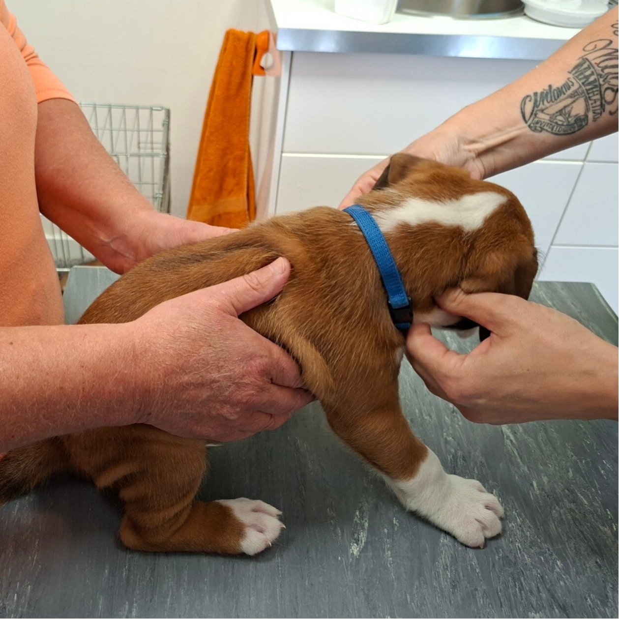Na de chip volgt de nodige vaccinatie en check up bij onze dierenarts Nina.